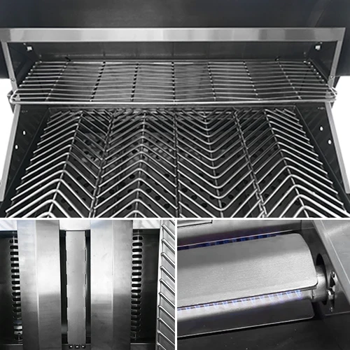 Two-Position Full-Width Warming Rack. Exclusive Patented Design Removable Heavy-Duty V-Grate Cooking Grate.